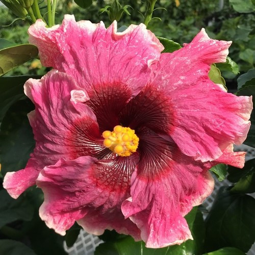 Plant DetailsFlower Color: dark pink with soft pink white edges & deep red throat Height: Up to 8 feet Width: 4-6 feet Foliage Color: Green Habit: Compact, shrub-like Bloom Time: Everblooming Hardiness Zones: 9-11 |