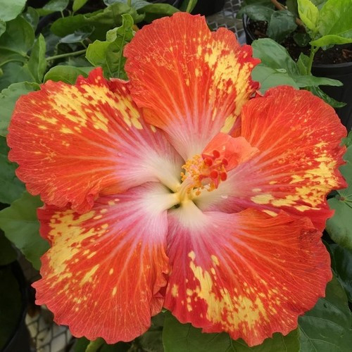 Plant DetailsFlower Color: orange redish with yellow speckles & pink & white stripe throat Height: Up to 8 feet Width: 4-6 feet Foliage Color: Green Habit: Compact, shrub-like Bloom Time: Everblooming Hardiness Zones: 9-11 |